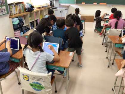 1年生はロイロノートを使って、自分の描いた絵をクラスの友だちと共有していました。いちはやく提出箱に提出できた子が、お友だちをサポートしていました。タブレットの使い方のルールを守ってこれからも学習に使っていきます。