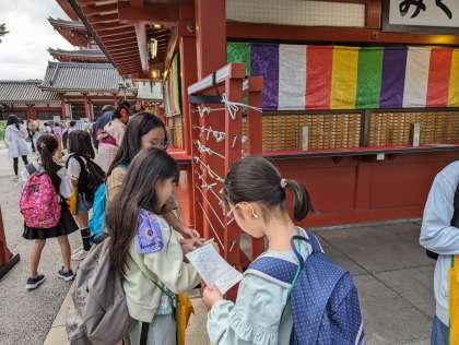 子どもたちが楽しみにしていた浅草に着きました。外国人観光客の方にあいさつをする子どもたち。話しかけられうれしそうです。