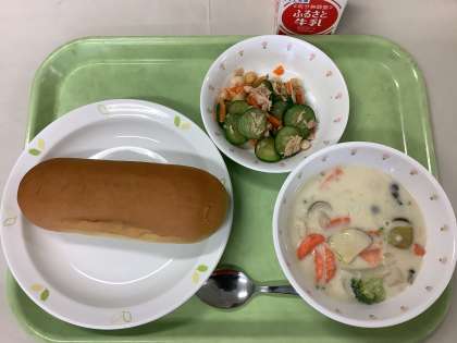 明日葉パン さつまいもシチュー ビーンズサラダ 牛乳