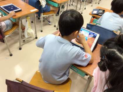 1年生は文房具から生まれた不思議な生き物をタブレットで描いて共有していました。