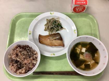 赤飯 ハマチの照り焼き ほうれん草の磯和え すまし汁 牛乳
