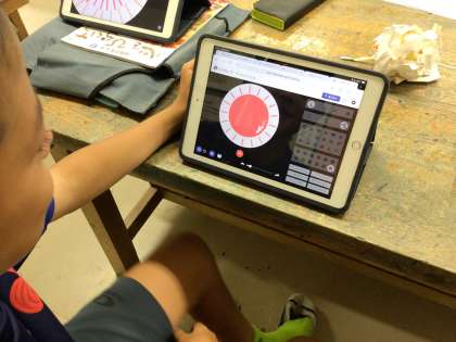 5年生は、図工の授業で「ゾートロープ」作りに取り組んでいました。映画やアニメーションの原理といわれていますが、小さい窓からのぞくと動きが連続して見えるような装置です。今回はアプリを使ってタブレットで作っていました。動きの変化もすぐに確認できるので、これも便利です。