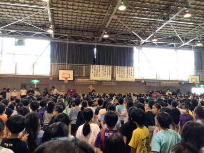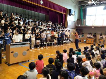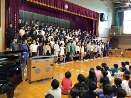 今日の音楽朝会は、6年の音楽発表会と全校で10月の歌「もみじ」を歌いました。