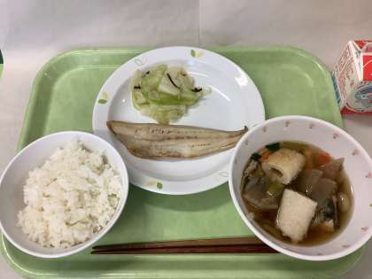 ごはん ほっけの塩焼き キャベツの塩昆布かけ きりたんぽ汁 牛乳