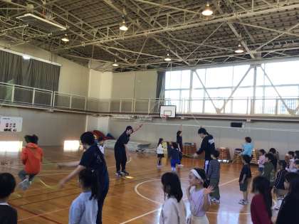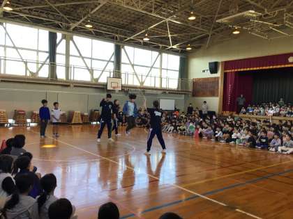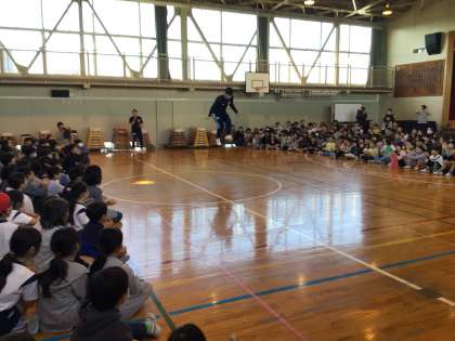縄跳びチャンピオンでもあるミズトリスポーツクラブの方が、中丸の子どもたちのために、ダブルダッチと短なわのデモンストレーションを披露してくださいました。目にも止まらぬ速さで回し続け、アクロバティックに跳ぶ姿はとてもかっこいいです。児童代表として4・5・6年生児童が一人ずつ、ダブルダッチに挑戦させてもらいました。引き続き、1時間目は1年生、2時間目は2年生が、ダブルダッチや短縄のスキルアップを教えていただいています。今日の中休みから早速、短縄ジャンパーが続出します。