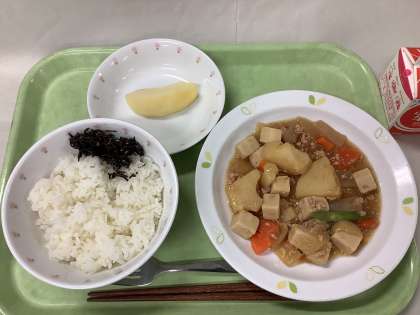 ごはん しそひじきふりかけ じゃがいものそぼろ煮 りんご