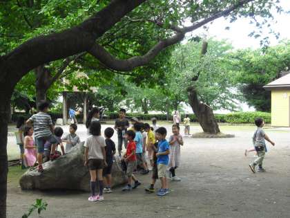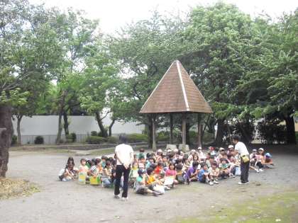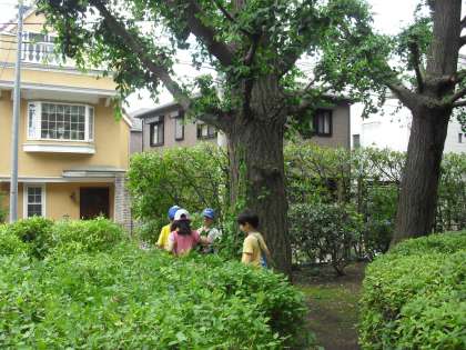 先日の避難訓練2次避難や昨年の公園探検では野沢公園に行ったので、今回は「野沢公園との違いを見つけよう」というめあてのもと、探索をしました。