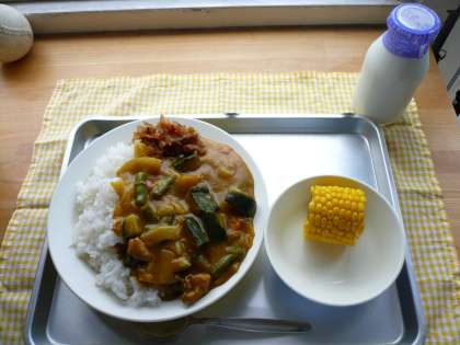 今日の献立は、夏野菜のカレーライス、蒸しとうもろこし、牛乳です。