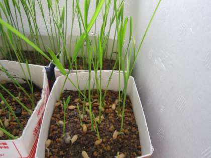 牛乳パックで育てたお米の苗も写真のとおり、青々と元気に育っています。