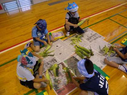 給食で食べるとうもろこしの皮を2年生のみんなでむきました。