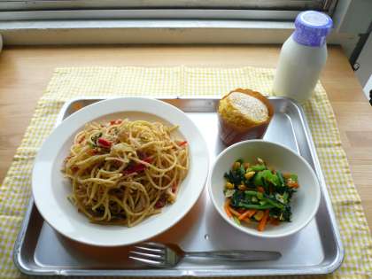今日の献立は、鮭とごまのスパゲティ、小松菜のアーモンドサラダ、