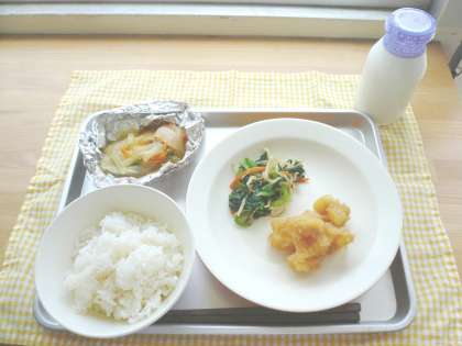 今日の献立は、ごはん、たらのホイル焼き、じゃがいもの甘辛煮、