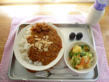 今日の献立は、キーマカレーライス、じゃがいもサラダ、牛乳、巨峰です。