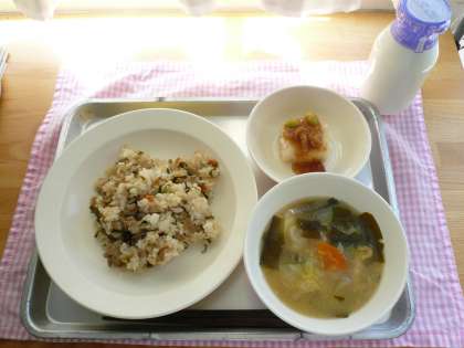 今日の献立は、豚肉とごぼうのごはん、みそ汁、揚げだし豆腐、