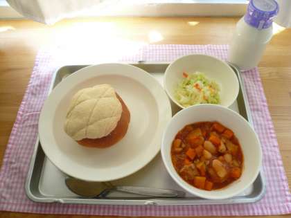 今日の献立は、メロンパン、ポークビーンズ、キャベツサラダ、