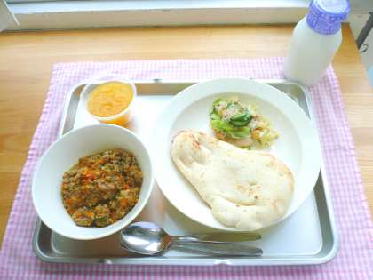 今日の献立は、ドライカレーとナン、豆サラダ、みかんゼリー、