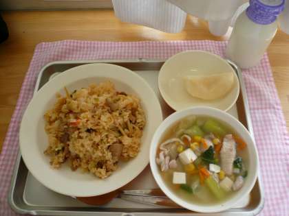 今日の献立は、キムチチャーハン、中華スープ、梨、牛乳です。