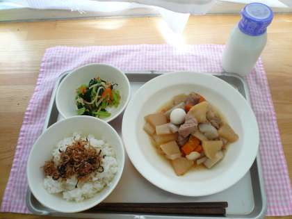 今日の献立は、ごはん、豚肉と大根のうま煮、野菜のからしじょうゆあえ、