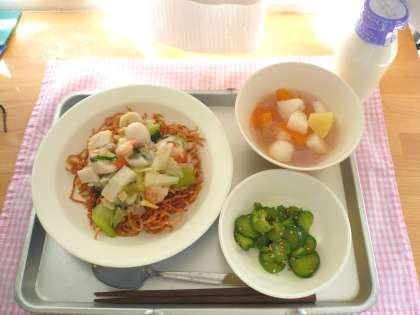 今日の献立は、皿うどん、きゅうりの中華味、梨のシュワシュワポンチ、