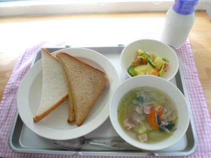 今日の献立は、二色サンド、ベーコンと野菜のスープ煮、