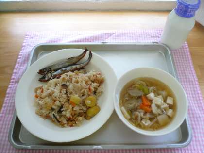 今日の献立は、秋の香りごはん、焼きししゃも、けんちん汁、牛乳です。