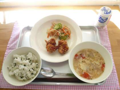 今日の献立は、わかめごはん、鶏のからあげ、こんにゃくサラダ、