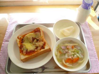 今日の献立は、ピザトースト、ヌードルスープ、梨、牛乳です。