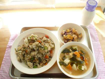 今日の献立は、磯おこわ、みそ汁、お豆かりんとう、牛乳です。