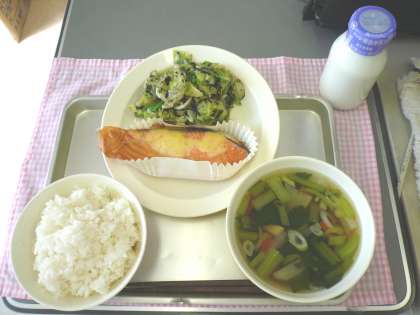 今日の献立は、ごはん、鮭のチーズ焼き、せたがや根菜汁、