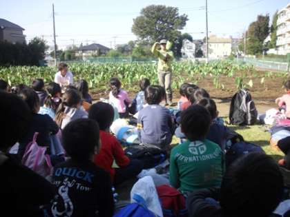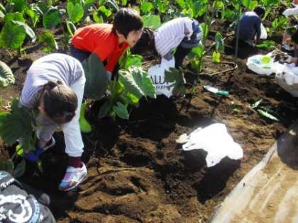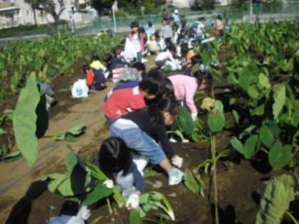 農園では、教育委員会の方から里芋の掘り方や農園での約束を教わりました。