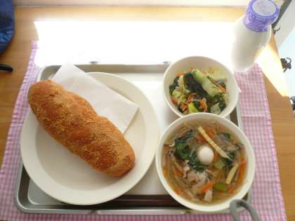 今日の献立は、あげパン、春雨スープ、和風サラダ、牛乳です。
