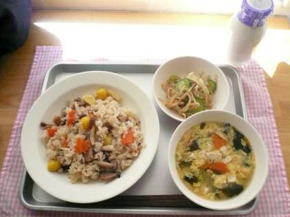 今日の献立は、吹き寄せごはん、かきたま汁、もやしのごま酢かけ、牛乳です。