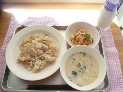 今日の献立は、里芋ごはん、飛鳥汁、切干大根のサラダ、