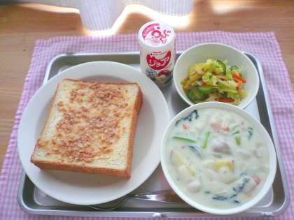 今日の献立は、つぶつぶピーナッツトースト、季節野菜のクリームシチュー、
