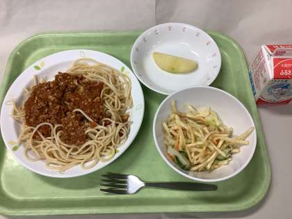 スパゲッティヘルシーミートソース じゃがいものハニーサラダ 洋梨 牛乳