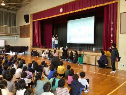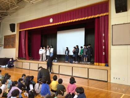 集会委員児童は全校児童が楽しめる内容の集会活動を毎月、計画、実行しています。今日は、集合時の縦の列を利用して、伝言ゲームを行いました。コロナ禍の時にはできなかったので、とても久しぶりに感じました。多くの児童にとっては、「初」伝言ゲームです。「あ」が難しく、次の子どもの背中に指でかくときには、「め」になっていました。ルールを守って楽しくできていました。