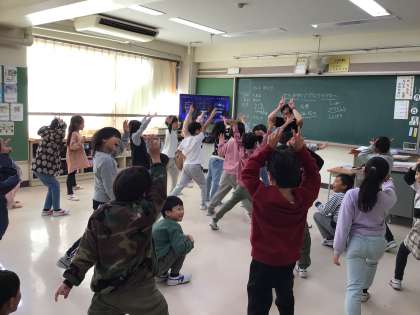 2年生が、「せたがやパブリックシアター」の方の楽しい出前授業を受けていました。みんなで楽しい時間につくるためにルールを守り、全身を思い切り使って表現することを感じ取っていました。