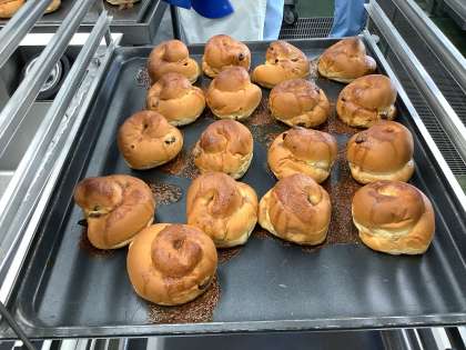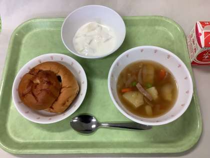 シナモンロール風 じゃがいもとハムとえんどうまめのスープ りんごヨーグルト 牛乳