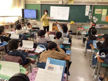 日差しが暖かく、3年生が元気に校庭でミニハードル走に取り組んでいます。2年生は、せたがやパブリックシアターさんの出前授業の最終日です。絵本の場面を切り取り、グループごとに劇にして発表しあっていました。別のクラスでは、鍵盤ハーモニカの練習に取り組んでいました。音楽専門の先生から教えていただき、とても上手になっています。