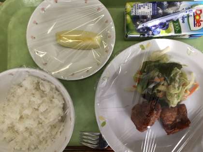 牛乳アレルギーの子どものことを考え、牛乳ではなくぶどうジュース、でもカルシウムは必要なのでサラダにしらすとわかめを入れました。子どもたちの大好きな唐揚げもあって大満足な献立です。