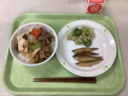 すき焼き風丼 わかさぎの唐揚げ ゆかり和え 牛乳
