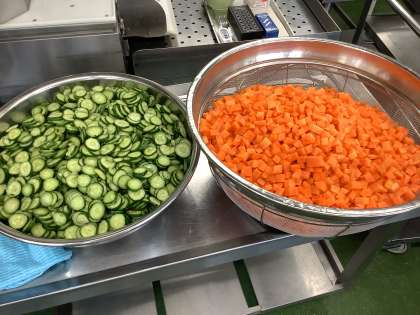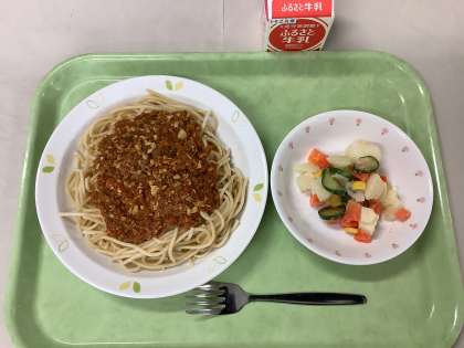 スパゲッティヘルシーミートソース マセドアンサラダ 牛乳
