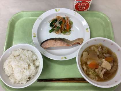 ごはん 鮭の塩焼き おひたし すいとん 牛乳