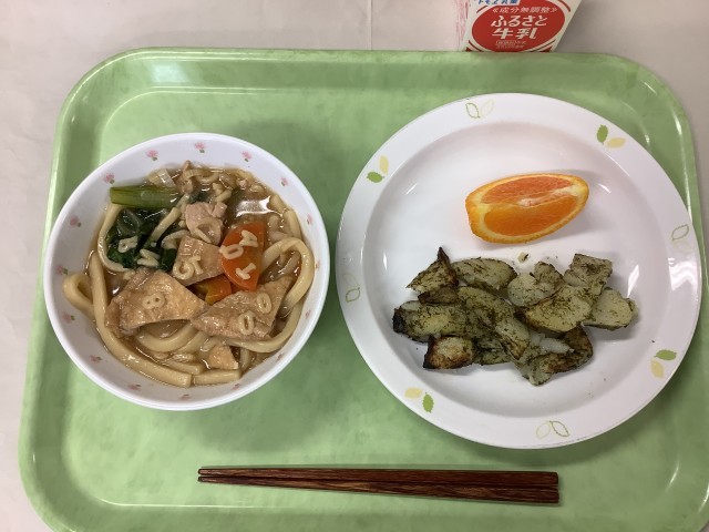 ★ABCKうどんとのりポテトは、6年生が家庭科の授業で考えた献立の中の料理です。ABCKうどんは、ABCマカロニの入ったきつねうどんです。
