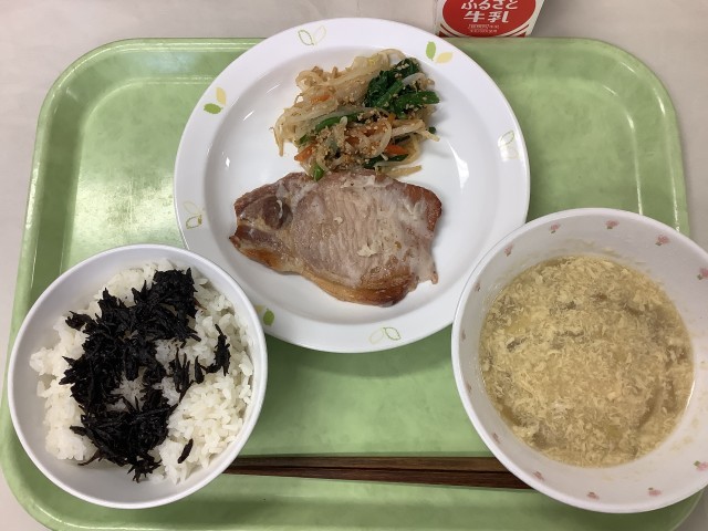 ごはん ひじきふりかけ 豚肉の生姜焼き ほうれん草のごま和え ベーコンと白菜の卵スープ 牛乳