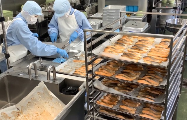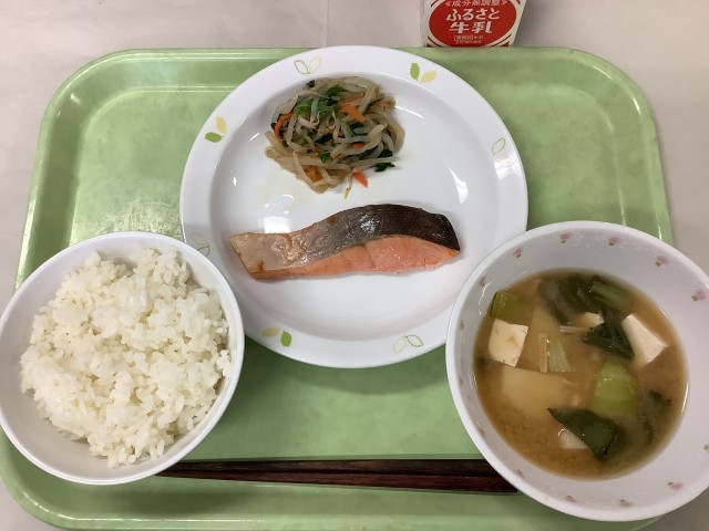 ごはん 鮭の塩焼き おひたし チンゲンサイときのこのみそ汁 牛乳
