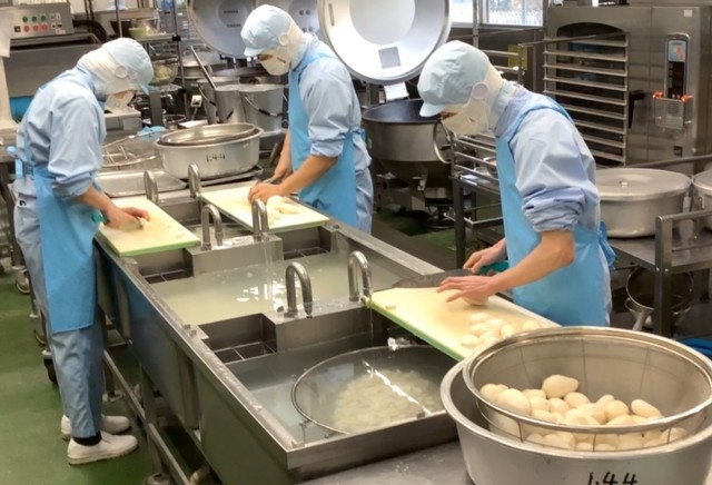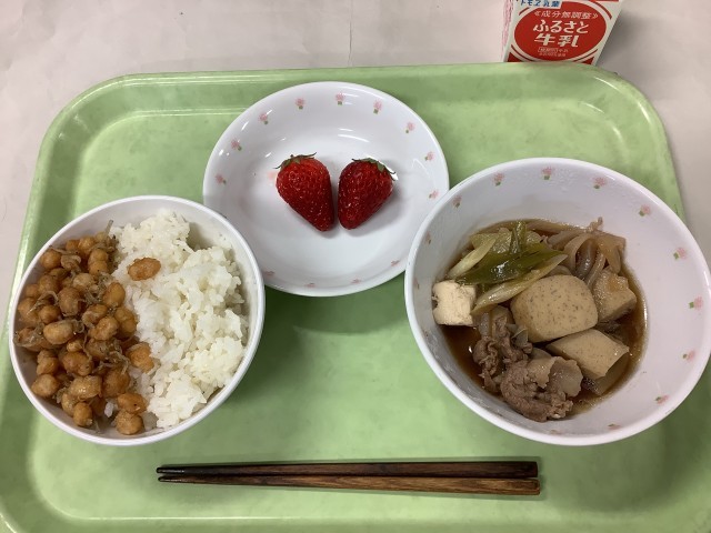 ごはん 大豆とじゃこの甘唐揚げ いも煮 いちご 牛乳