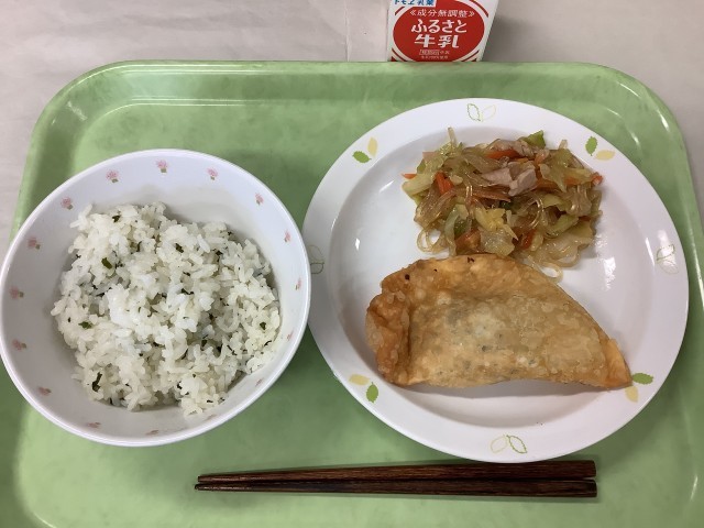 わかめごはん ジャンボぎょうざ 春雨の野菜炒め 牛乳