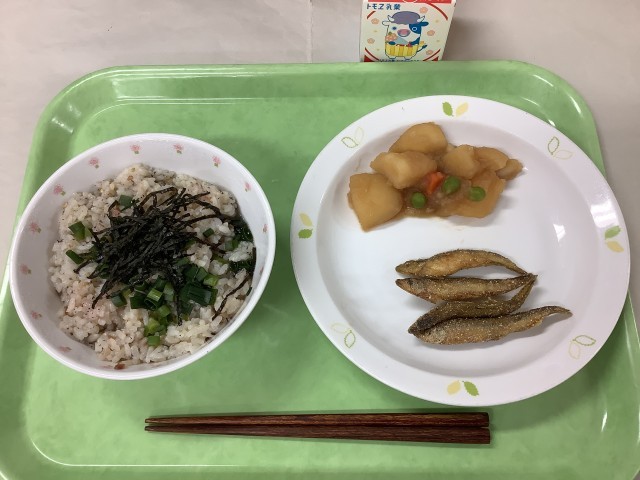 梅茶漬け わかさぎのカレー揚げ じゃがいもの甘辛煮 牛乳