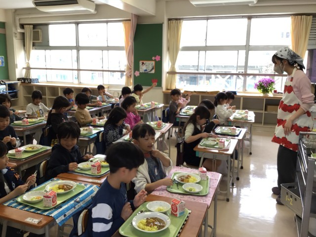 いよいよ1年生が待ちに待ったおいしい中丸の給食です。給食をつくってくださる調理員さんたちの動画を見てより今日のカレーライスが待ち遠しくなります。配膳のときも静かに待てていて立派でした。下膳のお手伝いボランティアを保護者の方にお願いしました。ご多用な中ご協力いただき本当にありがとうございます。